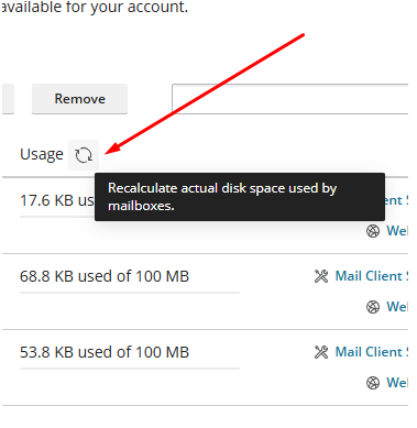 Έπειτα για να επιβεβαιώσετε πως έχει ελευθερωθεί χώρος στο πακέτο σας θα πρέπει μέσα από το mycp.gr επιλέγοντας το domain σας στο "My subscriptions" στην επιλογή "Mail" θα πατήσετε refresh usage stats όπως φαίνεται στην παρακάτω εικόνα και θα δείτε τι χώρος υπάρχει διαθέσιμος σε κάθε email σας.